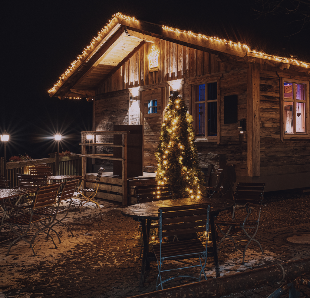 - In den Wintermonaten lädt zusätzlich unsere gemütliche Almhütte im Biergarten zum Feiern ein. Hier ist Platz für gesellige Runden mit bis zu 100 Personen