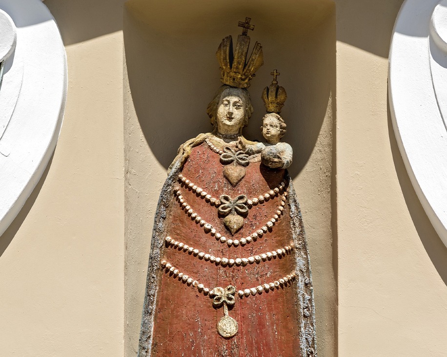 Diese kleine Wallfahrtskapelle liegt auf einer idyllischen Lichtung. Wunderschöne Votivtafeln – einige aus dem 19. Jahrhundert – erzählen von Dankbarkeit und Gebet. Der Legende nach rettete die Mutter Gottes während des Dreißigjährigen Kriegs einem Soldaten das Leben, indem sich unter ihm die Erde auftat. Zum Gedenken entstand 1690 die Kapelle, die bis heute von Pilgern besucht wird. Im Deckenfresko ist ein Jakobspilger mit der typischen Muschel am Gewand zu sehen.